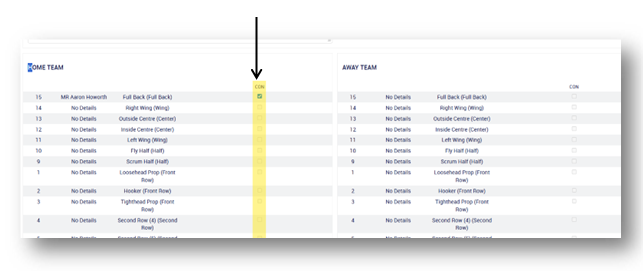 If a concussion is suspected during the match, tick the concussion box next to the relevant player’s name. This will automatically send guidance on managing the injury and notify the club’s RugbySafe Lead.
