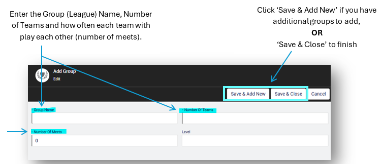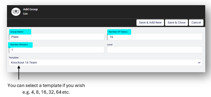 Note: If your cup competition includes pool stages before progressing to knockout rounds, you will need to create both the pool (league-style groups) and knockout stages within your competition.