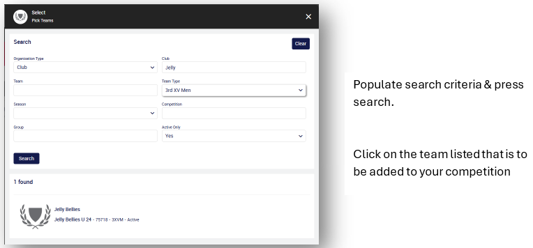 - In the Pick Teams / Replace Teams menu, enter the relevant search criteria.