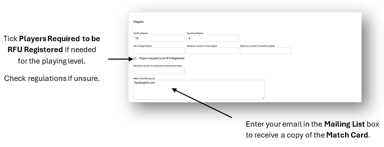 - If required, tick Players Required to be RFU Registered